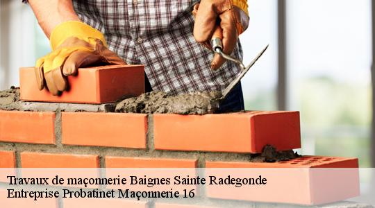Entreprise Probatinet Maçonnerie 16 accompagne tous travaux de maçonnerie à Baignes Sainte Radegonde et ses environs. Nous sommes présents pour vous accompagner tout au long de la réalisation de votre projet. Pour réussir chaque projet, notre équipe de maçon 16360 utilise les meilleurs de matériel et garantit la composition parfaite pour tenir les résultats dans le temps. En activité pour le département 16360 et ses villes, notre équipe de professionnels est au service d’une intervention de qualité et performante.